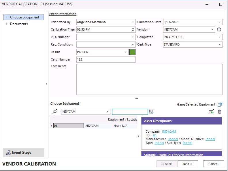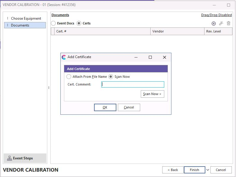 Documents are carried forward into the event if you have inserted them on the Equipment layout screen under the Calibration Info Tab. You can also add them on the fly by clicking the "Add New" icon.