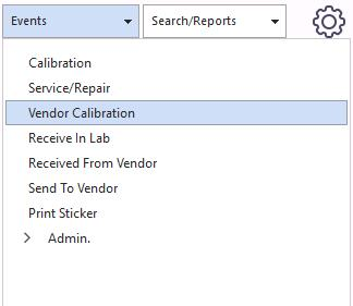 Vendor Calibration events can be launched by selecting "Events" on the main screen menu and then "Vendor Calibration."