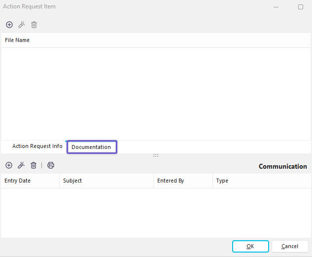 Action Request Communications can be recorded, and documentation can be saved with each communication item.