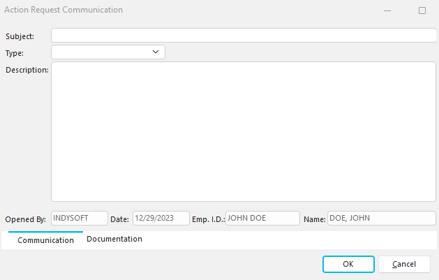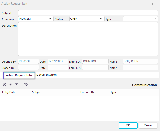 Users can add a subject, related Company, Status, Type, and description of each action request. The user that opens the action request is logged along with the closing user (when a closed status is selected).