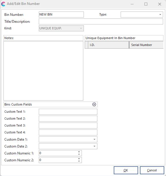 Note: The 'Kind' and 'Unique Equipment In Bin Number' fields are for users with the IndySoft Tool Management module installed.
