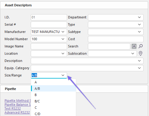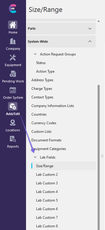 Add/Edit Lab Custom 1 (aka "Size / Range" in this example)