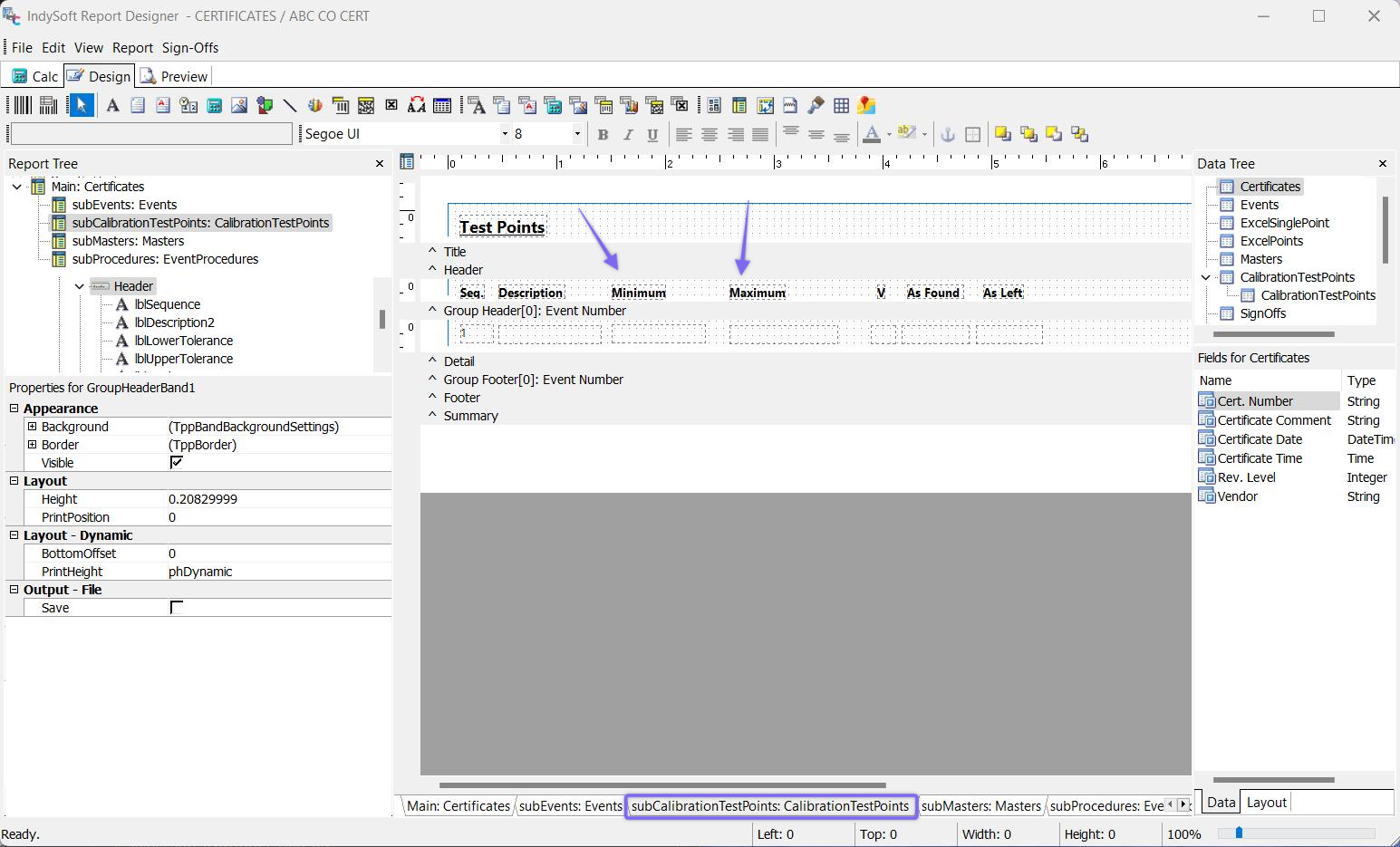We find the information we want to change on SubReport2: CalibrationTestPoints, and promptly delete Standard and relabel Tolerance - and Tolerance + to Minimum and Maximum. After our changes, our design is looking better.