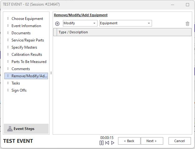 The 'Remove/Modify/Add Equipment' event step appears if the 'Global Modifications' event step has been selected for the current event type through the Work Flow Configuration Wizard - Event Steps.