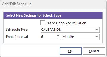 If you choose to 'Add' a schedule type for the selected equipment, the 'Schedule Information' dialog will appear, as shown below. If you choose to 'Modify' a schedule type, you will first be asked to select a schedule type to modify. The settings specified in the' Schedule Information' dialog will be applied if this schedule type exists for the select equipment (per equipment basis). If you choose to 'Remove' a schedule type, you will be asked to specify the type that should be removed.