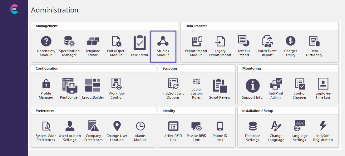 To launch the Studies Module, choose it from the IndySoft Utilities menu. The following dialog will appear. This dialog is where all your studies will be managed.
