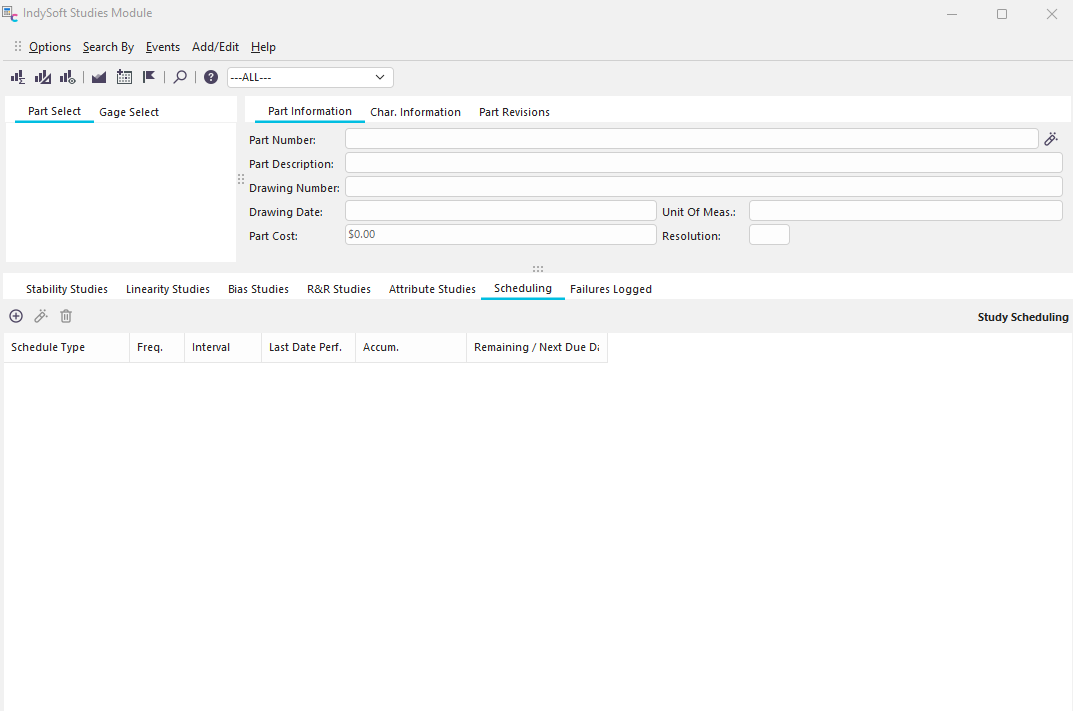 The bottom of the study's main form will contain at least seven tabs containing detailed information about the studies performed upon the currently selected Part/Characteristic or Gage. The first five tabs list stability studies, linearity studies, bias studies, R&R studies, and attribute studies. These grids resemble the Events listing on the IndySoft main screen's History tab. These tabs allow for quickly launching new events and editing previous events. The Scheduling tab allows you to view/edit schedules for parts/characteristics. The Failures Logged tab allows you to view any failed studies. In addition, you may have tabs containing legacy stability, linearity, or bias studies. You cannot launch new legacy studies but can still view them for auditing purposes.