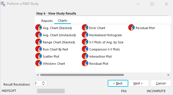 This step allows you to review the R&R and ANOVA results for the study. You can review three reports or thirteen charts to analyze the results.