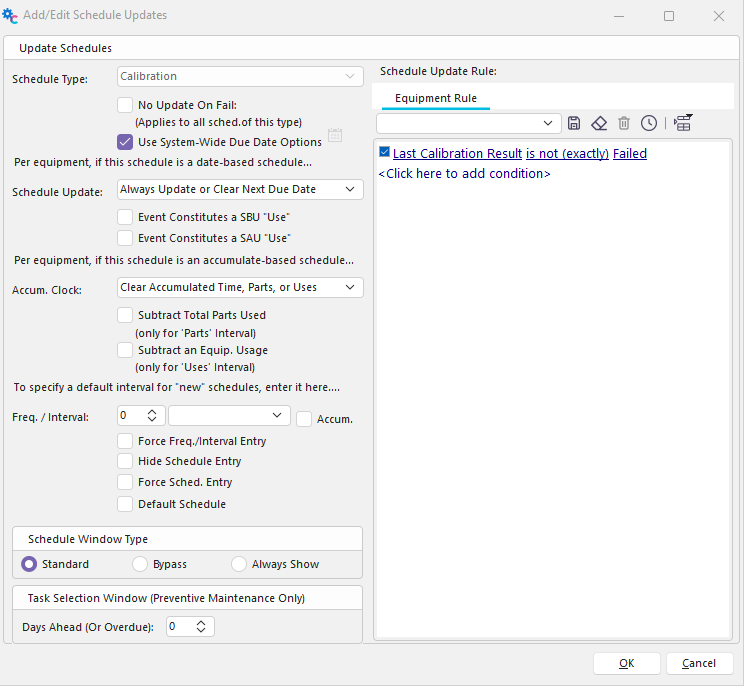 Custom Schedule Update Rules can be added by clicking <Click here to add condition>. The Equipment Rule function works similarly to Event Finder. Once a rule is created, it can be tested by using the stopwatch icon or saved. Saved rules are then available in the drop-down list for re-use. |