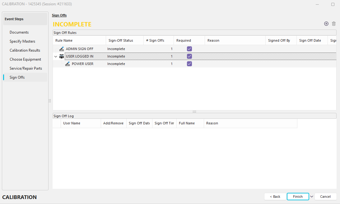 If the event is exited (through the 'Finish' button) before all the sign-offs have been completed, then any remaining sign-offs are logged to the Pending Work...Event Sign Offs grid on the main screen. At the time of the event finish, all users that can fulfill each remaining sign-off are logged as potential signers in these grid records. For instance, if you have 3 'System Administrators' setup in your database, and one of your events sign-off rules requires a 'System Administrator' sign offs, and this sign-off is not complete at the time of the event finish, then three records will be added to the 'Pending Work' event sign offs grid, one for each admin. Note that one or more of these records might be omitted if that same login has already been used for a previous sign-off - or will be required to accomplish another 'special' sign-off, like the 'Event Employee as Req. Signature'.