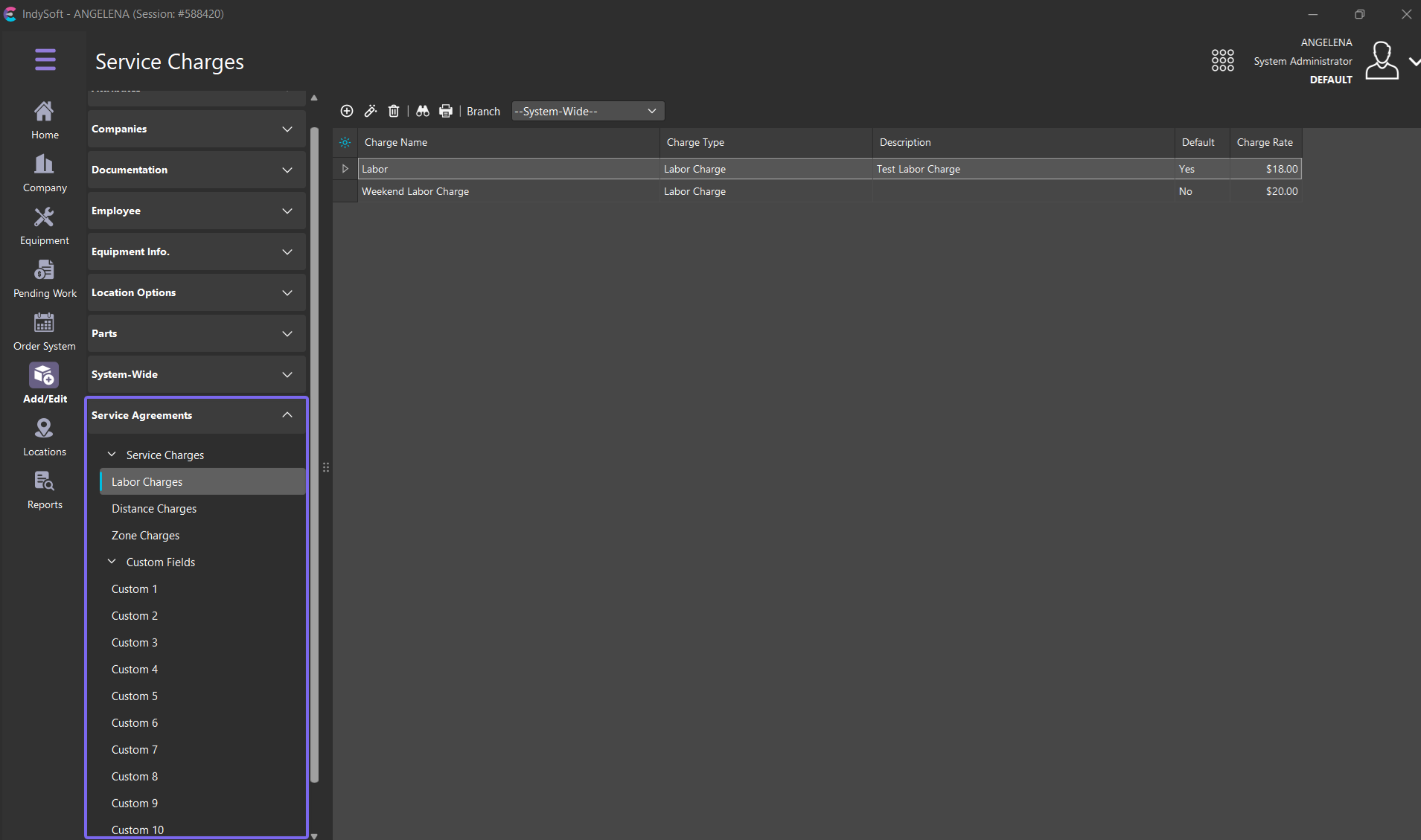 Unique to these add/edit list options is that they are either system-wide or they are Branch dependent. If the customer/user wants to set up default charges at a system-wide level, then they can add them under the "--System-Wide–" Branch. Otherwise, if branches have unique charges, those can be set per branch and default to Agreements, requests, work orders, estimates, and invoices. If no branch is specified, then the system-wide option will be employed (if applicable)