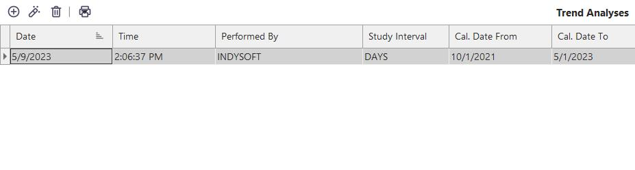 This grid lists all trend analysis studies performed on IndySoft data. These records can be sorted by any field or multiple fields by clicking in the field header section on the appropriate field (to select multiple field headers, press the Ctrl key). The records can also be filtered by pressing any of the buttons available to the right of each field name. This button will display several quick filtering options. Press the button at the bottom of the grid to remove a filter. Four buttons are available above the 'Studies Performed' grid: