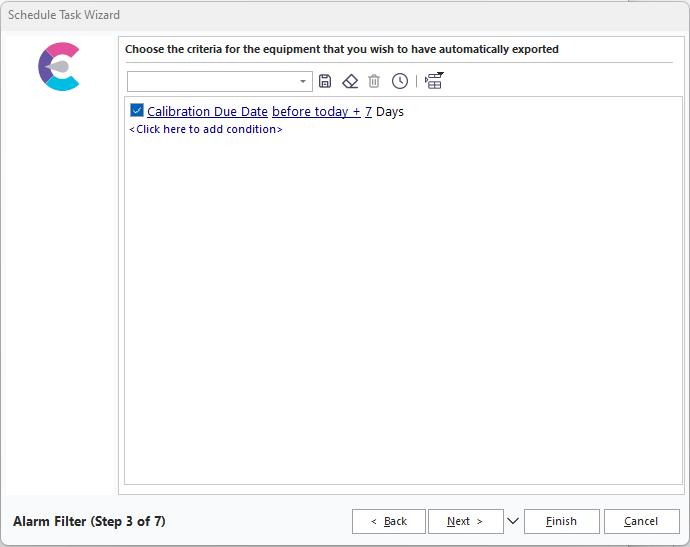The Alarm Filter allows you to establish the criteria for activating the alarm based on search filters. For more information on how to use search filters, see Equipment Finder.