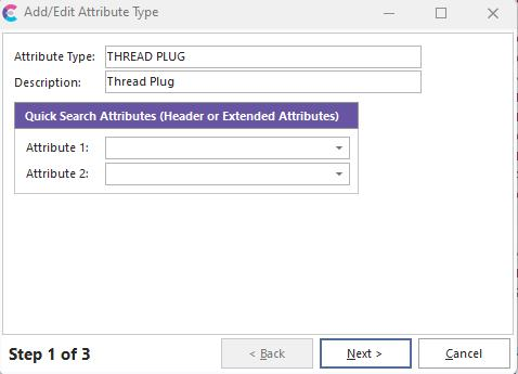 Quick Search Attributes - Attributes fields can be used within equipment filter boxes like EquipmentFinder. To select attributes by name, you must first select the attribute type from the 'Attributes' field in the filter box. The 'Quick Search Attributes' fields allow you to select 2 of the attribute fields from Step 2 that should automatically become part of the filter box whenever this attribute type is selected in the filter box. This saves you the time of always selecting the same search criteria based on this attribute type. For example, say we have a text-based attribute named 'DIRECTION' and a numeric attribute named 'PITCH.' Whenever we select the 'THREAD PLUG' attribute type in a search filter, we typically want to search on both of these fields. So in the filter box, as soon as you input this: