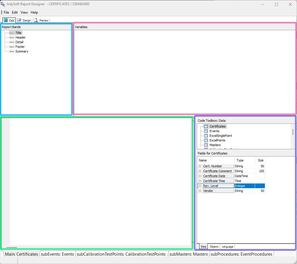 The Calc Tab allows you to add Object Pascal code to a report. If you have not had prior experience with Object Pascal or are not comfortable with programming, IndySoft may be able to assist in your report efforts through our IndySoft Services. Contact IndySoft Sales to discuss a quote for any reporting requirements you feel are beyond your experience level. Be aware that some of the Standard Templates shipped with the product include code in the Calc Tab that can be broken as you work on customizing them to make your certificates, invoices, etc.