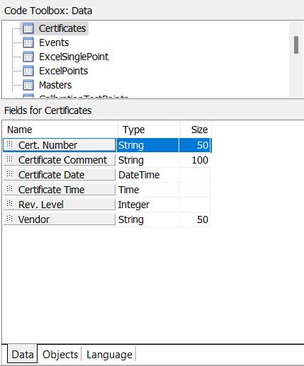 The Code Toolbox has three tabs: Data, Objects, and Language. Each allows you to easily locate items to drag and drop into the code window.
