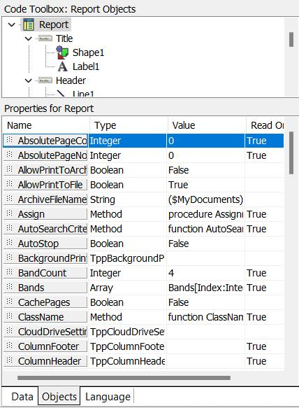 As an object is selected in the Objects, outline tree, that object's properties are displayed below. These properties are read-only - for reference. If you want to modify properties, use the 'Design' tab. Select the object in the 'Design' tab and modify properties from the appropriate header controls, right-mouse click options, or 'Properties' object inspector. The Properties section on the Calc Tab - Objects tab is helpful because it allows properties to be dragged/dropped into the Calc tab code. Note the small dots to the left of each property - drag from this property title into the appropriate position in the Calc tab code: