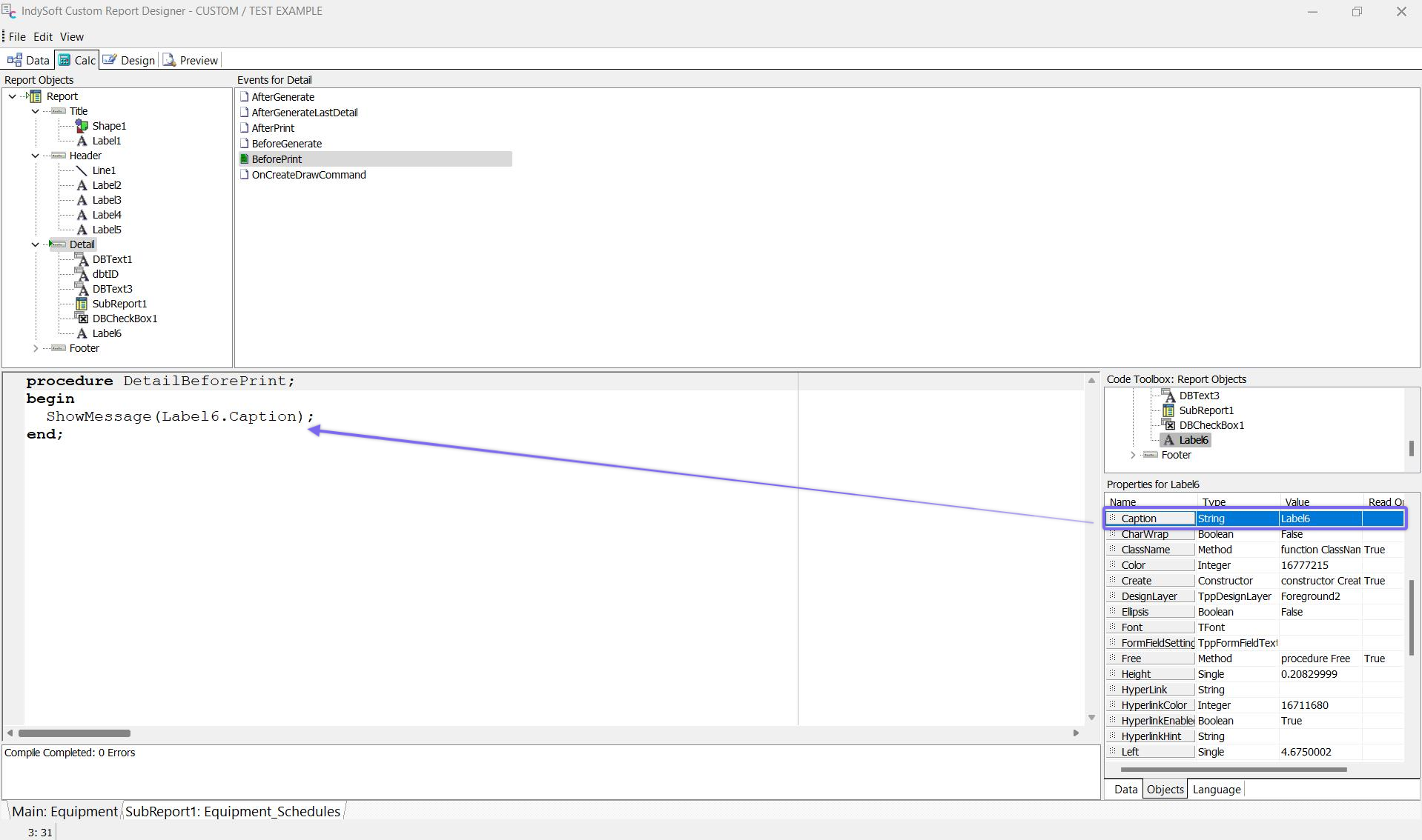 The Objects sub-tab is in the bottom right of the Calc tab. This tab shows a comprehensive listing of all objects in the report in outline form, starting from the main Report object on the top: