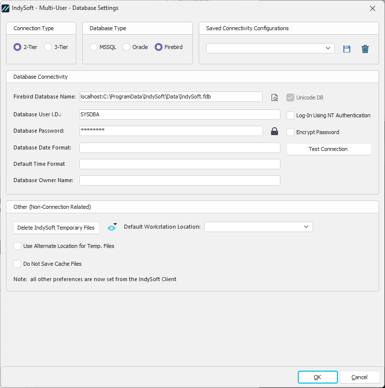Database Password - Enter the password associated with the 'Database User ID' above to connect to the IndySoft Firebird database. Note that this password is encrypted when saved locally. By default, this is 'masterkey'.