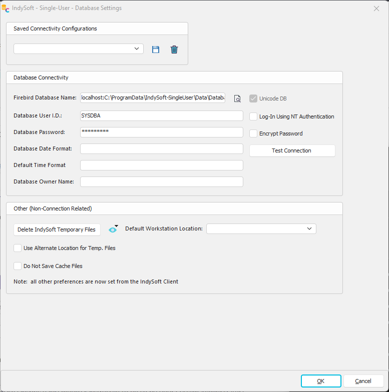 Database Connectivity options are used to make a connection to the IndySoft Database - which for Single-User clients is installed locally on the same computer as the client: