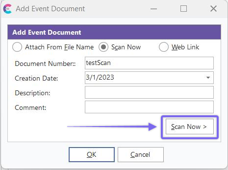 The Document Scanning Wizard can be started from within the Document section of an Event Step.