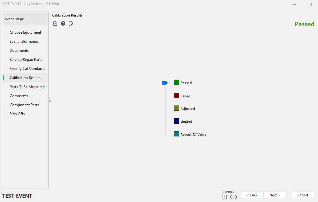 The 'Calibration Results' event tab appears if the 'Test Point Measurements' event tab has been selected for the current event type through the Work Flow Configuration Wizard - Event Steps.
