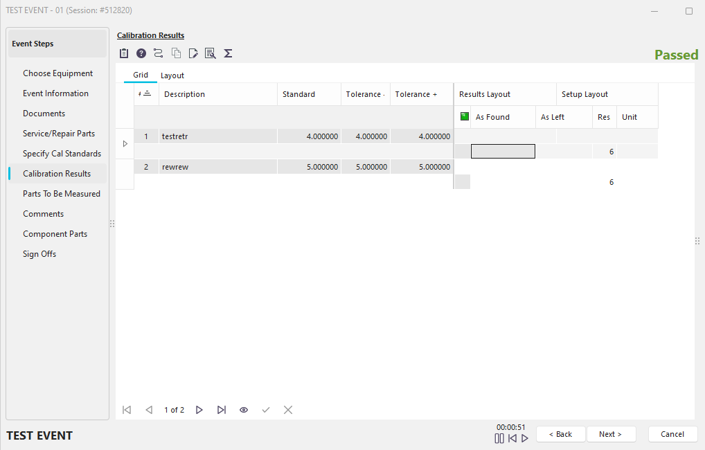 If the selected equipment contains test points, the event tab will contain the 'Calibration Results' grid, as shown below: