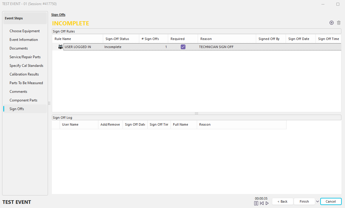 If the user name and password combination are correct, this sign-off will be added for the event, and the Sign Off Note will be saved with the sign-off. To remove this sign-off, you must again provide the correct username and password combination. All sign-off removals are noted in the sign-off grid, so a complete audit trail is seen.