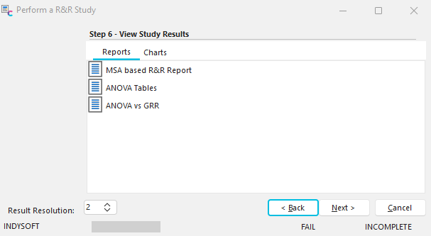 This step allows you to review the R&R and ANOVA results for the study. You can review three reports or thirteen charts to analyze the results.