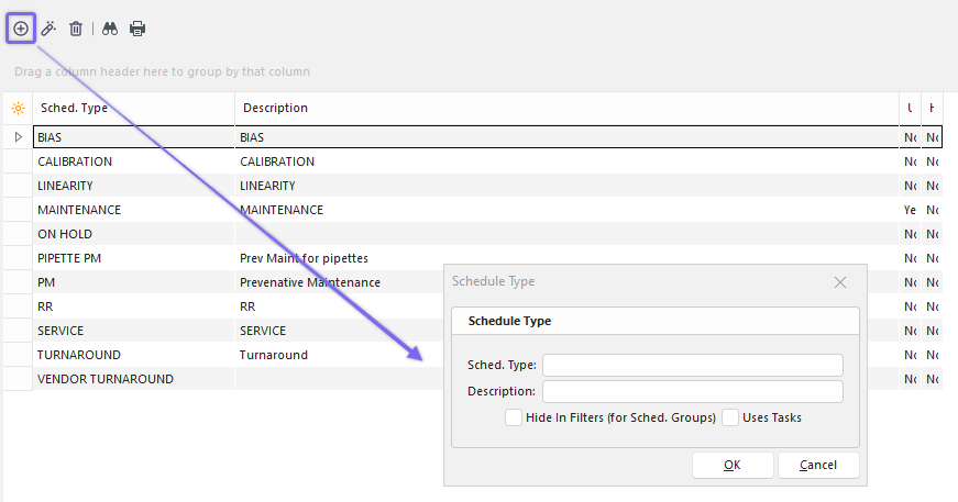 The Schedule Types list, by default, is already populated with the six most common schedule types. The option exists to add schedule types such as OOT - Out of Tolerance, etc. The Schedule Type list is used when Scheduling events.