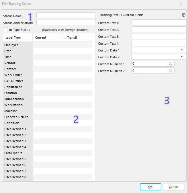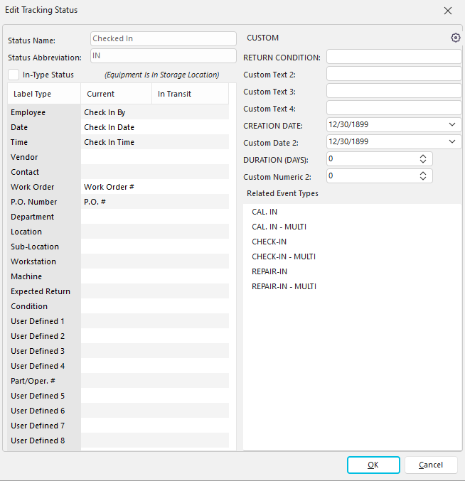 The In-Type Status checkbox can be used in Tooling Management environments to specify whether or not a tool is on-hand. Note: This is only applicable to the Classic view.3. Tracking Status Custom Fields