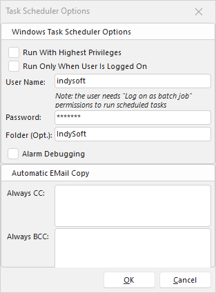 Before a Windows Scheduled Task can be added, you must use this dialog to specify a user that will be used to run each alarm by Windows. Be sure to choose a valid Windows user with all the necessary privileges to run an IndySoft alarm. If a task is registered using the Administrators group for the security context of the task, then you must also ensure the Run with highest privileges check box is checked if you want to run the task. If you want only to have an alarm run when a user is logged into Windows, check the Run Only When User Is Logged On option.