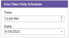 One Time Only alarms are designed to run only on one specific date and time. First, select the One Time Only alarm selection item from the Alarm Type tab to use this alarm. Next, click the Times tab and set the exact date and time to execute this alarm.