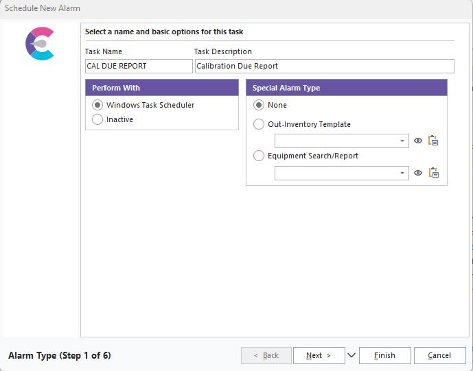 When checked, you can select a template from PrintBuilder from the drop-down menu used for reporting on the equipment currently checked out. If checked, the number of steps in the Schedule New Alarm will change from 6 to just 4. Out Inventory Options are available in Step 3. |