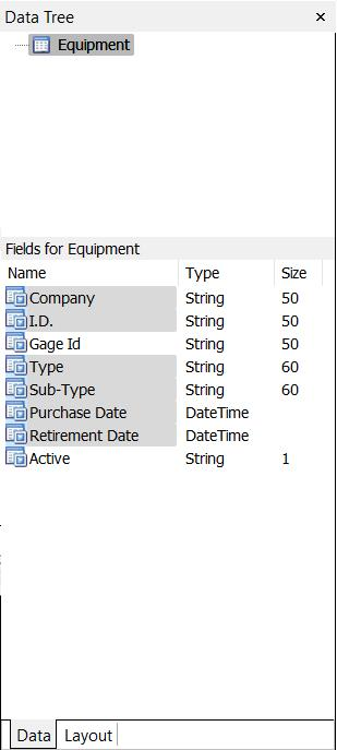Using the Data Tree below, we'll select the Labels of COMPANY, GAGE_SN, GAGE_TYPE, SUBTYPE, PURCHASE_DATE, and RETIRE_DATE in a tabular style. After selecting the fields (CTL + Click to group them), drag them to the far left of the HEADER section, then re-position them individually, as shown in the above example. You can also drag each field individually and place the field where you want. Also, you can click each field and edit or rename it.