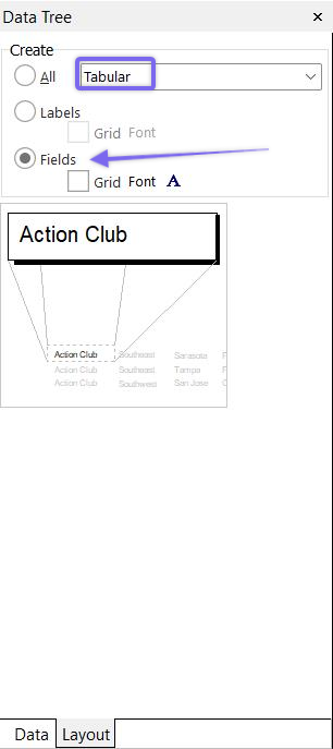 Next, we need to add the details. We'll use the same trick with the Data Tree, this time selecting Fields in the Layout tab.