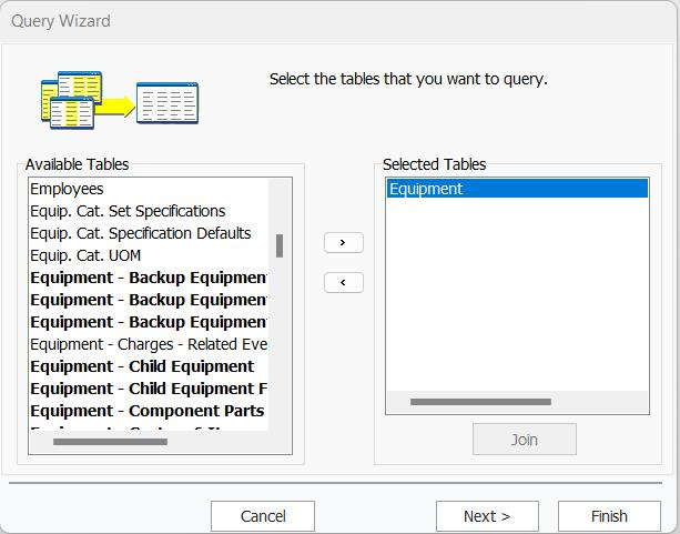 In this example, scroll down on the left column to select the GAGES table (Equipment). (Double-click or highlight and click the right arrow).