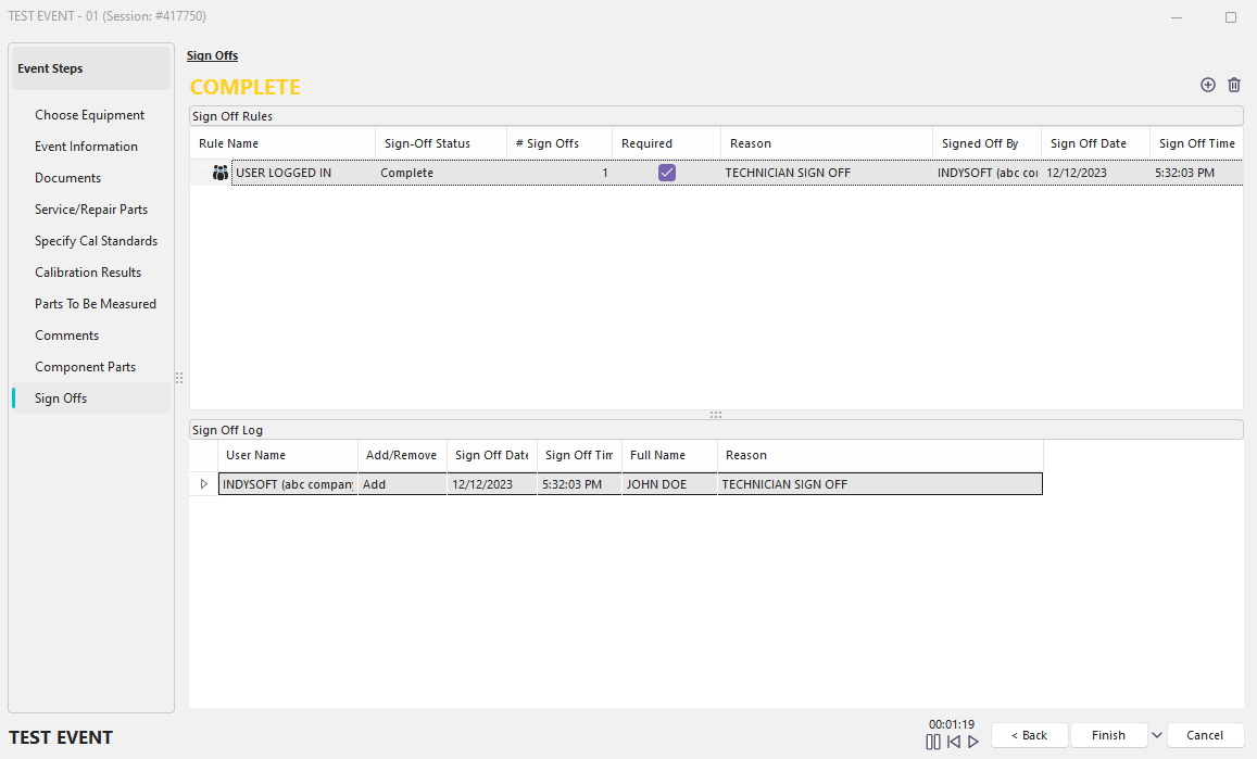 After signing off, the Sign Off section will become complete, and the sign-off credentials (and note) will show in the area above the 'Sign Off Rules,' you will then be able to complete the event.