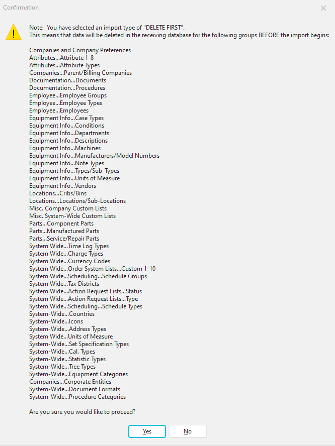 This option imports like ALL but first deletes all records from your database for the current group. This ensures that only the records in the import file for the current group will be in the database after the import. This is a very powerful but dangerous option - it should only be used when you know it is necessary. A couple of examples: say you are importing workflow configuration. In that case, it is often preferable to use DELETE to ensure that the events imported are the only events left on your system. Event workflows typically work together as a system; you might not want to mix and match events. Another example: say you are a technician that only has to go out into the field every few weeks. Suppose you use the DELETE option for importing equipment into your mobile Single-User database. In that case, you are insured that the only equipment records left on your laptop (that runs the Single-User version) are up-to-date records. Suppose you mix new equipment with older items synced months ago on earlier trips. In that case, you might be tempted to pull up those equipment records in the Single-User database while at the customer site and think the data is current, print an incorrect certificate, etc. A final example: say you are using the Export/Import Utility to sync occasional equipment and add/edit lists between a production environment and a test environment. In this case, you almost surely do NOT want to use the DELETE Import Type. Because as you import the assets or Add/Edit items, you will be removing potentially hundreds/thousands of other records. Since this operation involves a delete, you must confirm this choice before proceeding. The confirmation dialog lists all the subgroups that will be deleted if you choose to proceed. Below is an example: