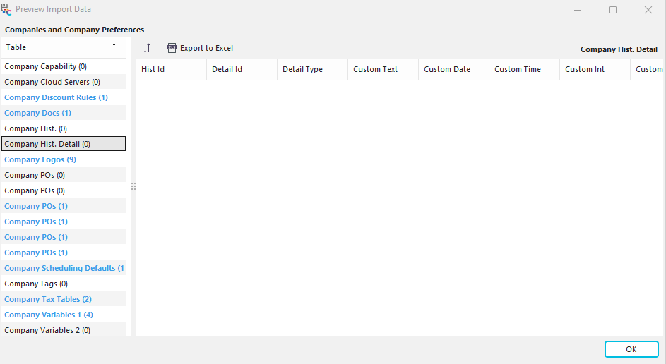 Note that the preview window has two sections, divided left/right on the dialog. The left-hand section has 1 column - this section shows all the distinct tables. (Note that the names are 'friendly names,' not the actual table names). As you select tables from this grid, the contents of the table (as stored in the import file) are shown on the right. Again, the field names for each table shown on the right are 'friendly,' not the actual field names. You cannot modify the tables or fields from this dialog - it is shown only for reference. Table contents can be exported to Excel from the option above the right-hand grid: