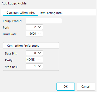 During this step, choose a unique name for the new Equipment Profile, the port that gage will be plugged into, and the baud rate. In addition, select the Data Bits, Parity, and Stop Bits for the port connection. For more information on which settings are appropriate for your gage, see the documentation for your RS-232 gage. Click 'OK' if finished or the Text Parsing Info. tab.