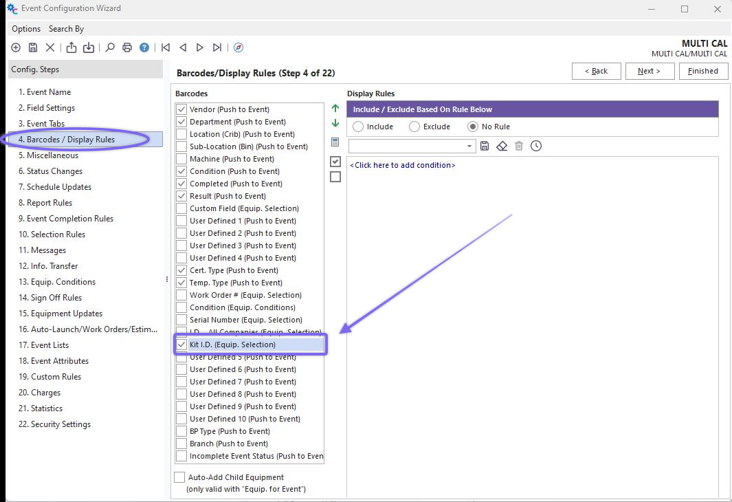 Kits can also be selected into IndySoft events using the barcode features in the Event Configuration Module. For more details on setting up and using this feature, see the 'Event Configuration - Barcodes / Location Rules' topic in the main IndySoft help. Note: This option is only relevant for events that allow selecting multiple pieces of equipment - meaning events with a 'Choose Equipment' tab selected within the Event Configuration Module. As a quick summary, select the 'Kit I.D.' option among the barcode options in Step 4 in the Event Configuration Module, as shown below: