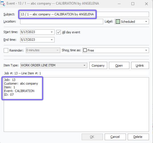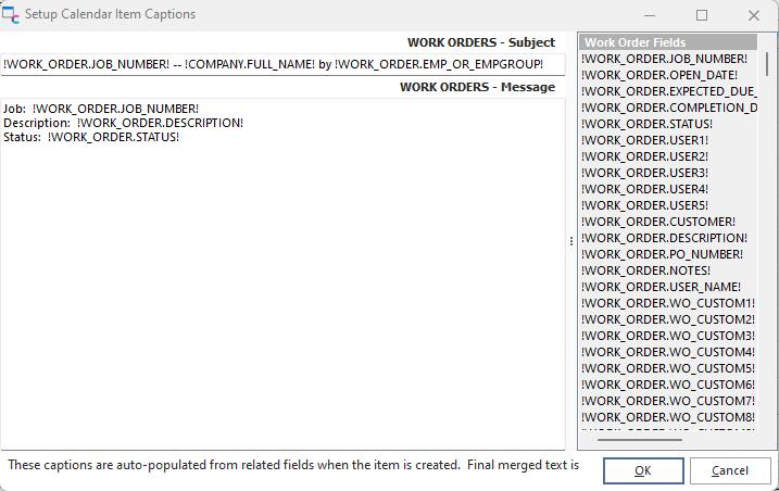 To access work order information, double-click on it in the grid (see Grid View). Use this dialog to configure the item captions and item memo text for scheduled Work Order items and scheduled Work Order Line Items. These two values for each linked calendar item are noted below: