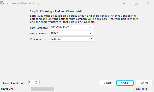 Each study must be based on a particular part and characteristic. Once a part company has been chosen, then only parts for that company will be available. After a part has been chosen, then only characteristics for that part will be available.