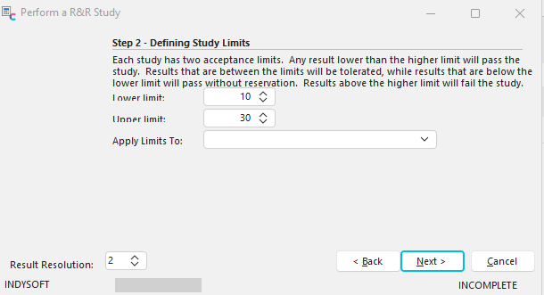 Several pieces of information should be entered during this step. Each study has two acceptance limits. Any result lower than the higher limit will pass the study. Results between the limits will be tolerated, while results below the lower limit will pass without reservation. Results above the higher limit will fail the study.