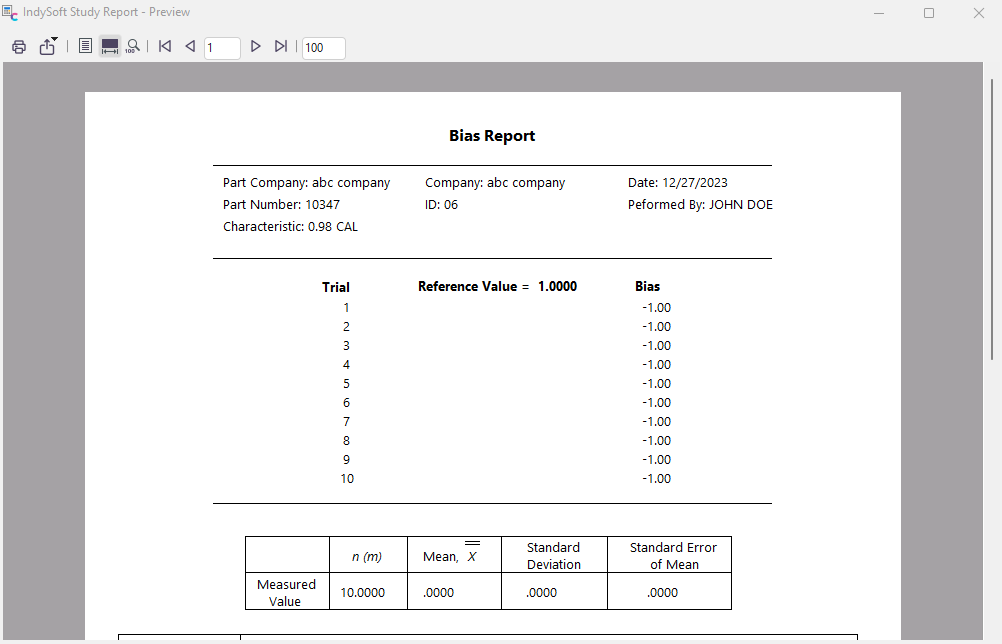 This screen shows your bias study results. You can view the Bias Analysis report or the Bias Histogram.