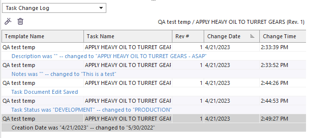 In the right-hand panel, you will have a list of your tasks for the designated template (in this example, all tasks are visible for 'TEST_TEMPLATE_EQUIP'). This allows you to switch between tasks easily.