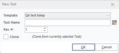 You will first be prompted to create a new task. You must enter a template, task name, and revision # to do so. The following dialog will appear: