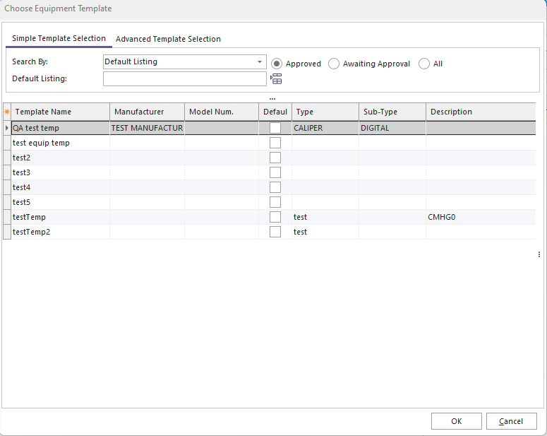 Click on the to choose an equipment template. You can choose to search for a simple or advanced template selection. See the following dialog: