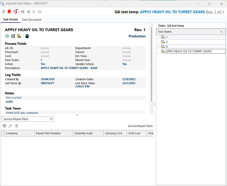 Each task has associated equipment requirements, part requirements, and schedule update rules. Fields (hyperlinks) in the process document can be quickly modified, like Equipment View and/or Template Editor. In addition, expanded interfaces can be created through the IndySoft Services Group utilizing custom scripting and project features. Any hyperlink in the task document can launch a script project. These projects can have their forms & interface, all configurable within IndySoft. These scripts can directly modify the database, or they often return a line of text to the task document itself.